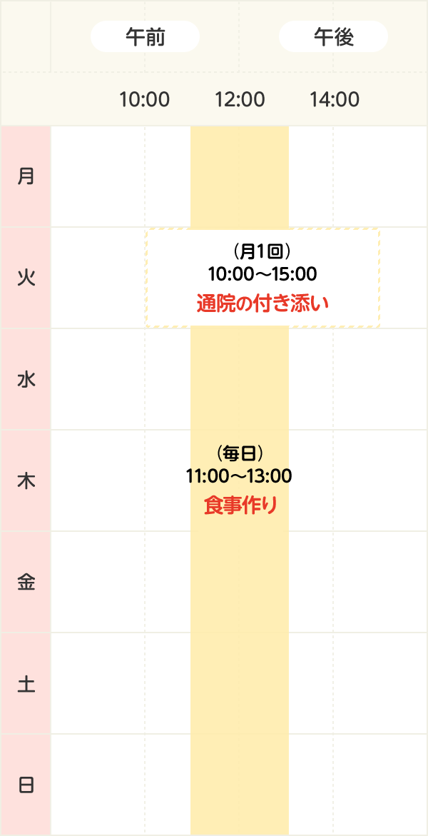 近所に家族が住んでいるが、日中は仕事のため対応ができないので、昼の食事作りと、見守りを兼ねて毎日サービスを利用。あわせて月1回の定期的な付き添いを利用。