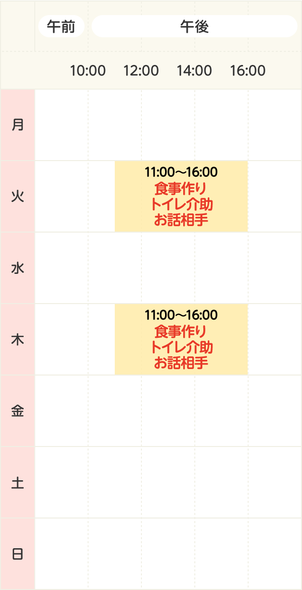 同居の娘様が基本的に介護をおこなっているが、定期的に介護を休むため、ご自身の時間を作るために、食事作り、トイレ介助、話相手でサービスをご利用。