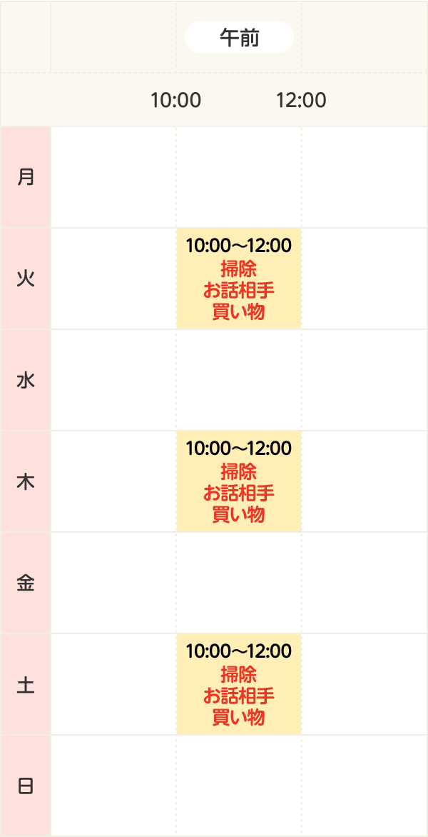 お部屋の掃除、買い物の付き添い、食事作り、ときには趣味や話相手としてサービスをご利用。定期的に訪問することで様子を確認することができ、ご家族にご様子を連絡する事も可能。